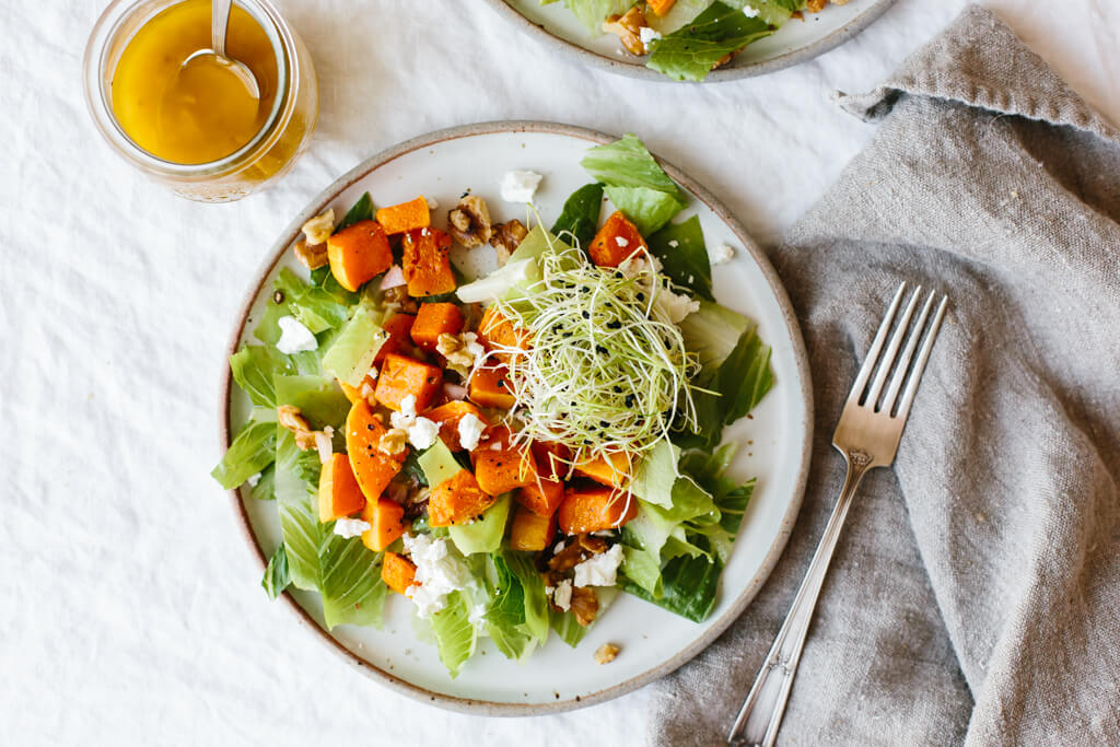 ES ensalada de calabaza asada es fácil y se une rápidamente. Solo hay un puñado de ingredientes, que incluyen calabaza asada, lechuga romana, queso de cabra, nueces y brotes, pero está lleno de sabor. ¡Es una receta de ensalada de otoño perfecta!