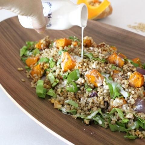 Coloque la calabaza, la cebolla, las nueces y las semillas de lino en un tazón grande. Corta las hojas de lechuga por encima y revuélvelas suavemente.