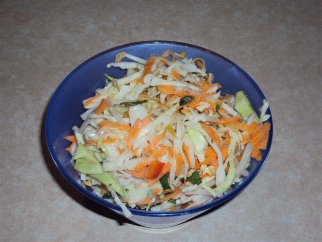 Combine el repollo, las zanahorias, los pimientos, los brotes de soja, la menta y el condimento en un tazón grande.