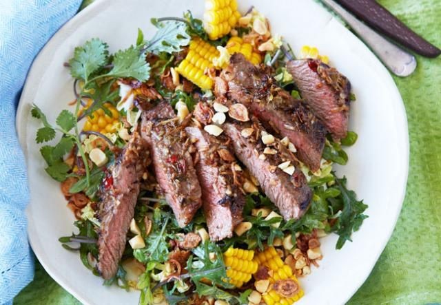 Ase la carne a la parrilla en una placa de barbacoa caliente o en una sartén Chargrill durante 3 minutos por cada lado. Descansa y corta. Cortar los granos de la mazorca de maÃz.