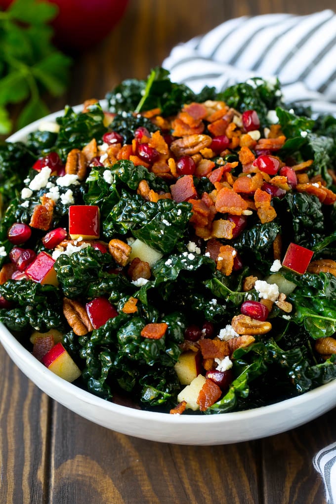 La ensalada de col rizada es una excelente manera de agregar más nutrientes a su dieta. El repollo se considera un superalimento y es rico en calcio, manganeso, vitamina A, vitamina C, potasio y cobre. El repollo es bajo en calorías, alto en fibra y bajo en carbohidratos. Muchos de los demás ingredientes de esta ensalada son saludables, incluidas las manzanas, las granadas y las nueces. Si está buscando la ensalada más saludable posible, puede omitir el tocino o usar tocino de pavo. Dicho esto, creo que el tocino realmente agrega mucho sabor, ¡así que te recomiendo que lo dejes!