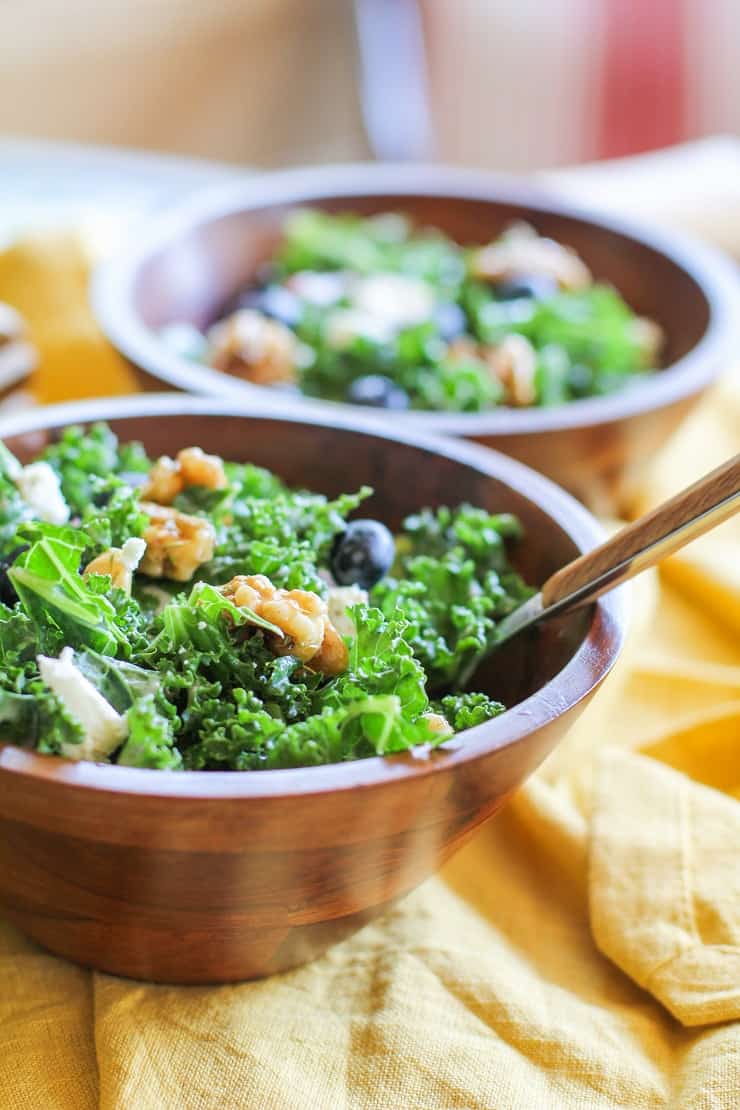 Es elegante, hablemos. Comencemos por masajear las hojas de col para aliviar el estrés… err… Quiero descomponer las fibras duras, haciendo que las hojas sean más fáciles de masticar. Todo esto requiere un poco de jugo de limón y esfuerzo. Mientras la col rizada se marina en su estado relajado con limón, traiga algunas nueces con romero fresco (o seco) y jarabe de arce puro para darle a la ensalada algo muy especial. Agregue un poco de queso de cabra (el queso feta también funciona), arándanos frescos, y únelo todo con una vinagreta cremosa de arándanos casera y tendrá un batido bastante salvaje con la reina de todas las verduras (col rizada).