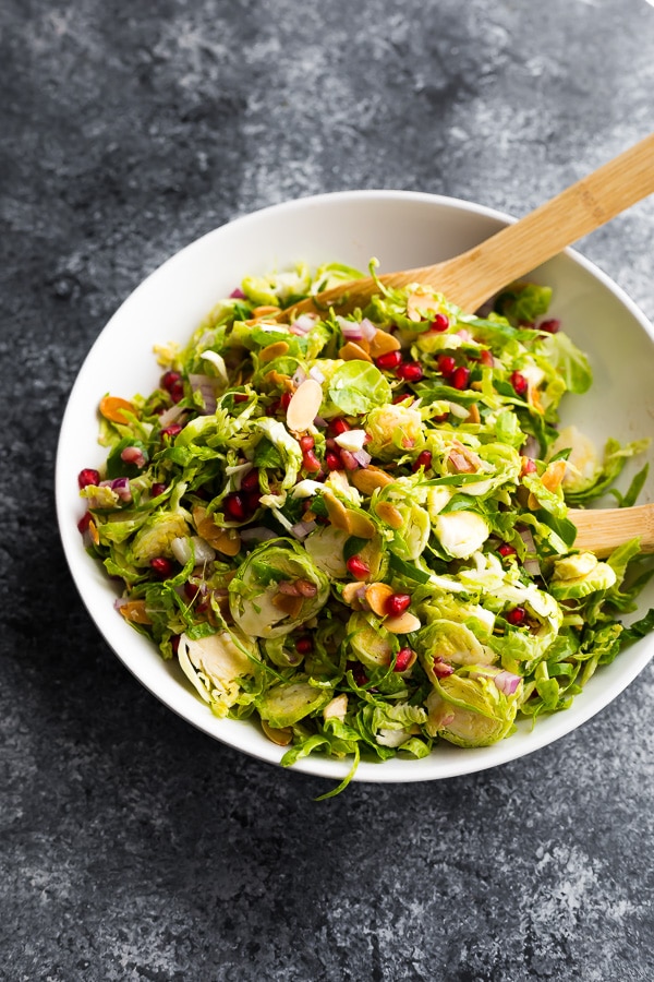 La ensalada de coles de Bruselas afeitadas tiene rodajas de almendras tostadas, semillas de granada dulce y una vinagreta fuerte. Perfecto para un plato festivo. Vegano, sin gluten, paleo.