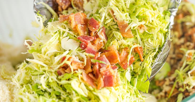 - Luego echa todas esas hermosas coles de Bruselas ralladas en un bol enorme y mezclar con tocino, nueces y parmesano. (¡Para una preparación fácil y sin complicaciones, use el microondas o el horno mientras prepara las coles de Bruselas!)