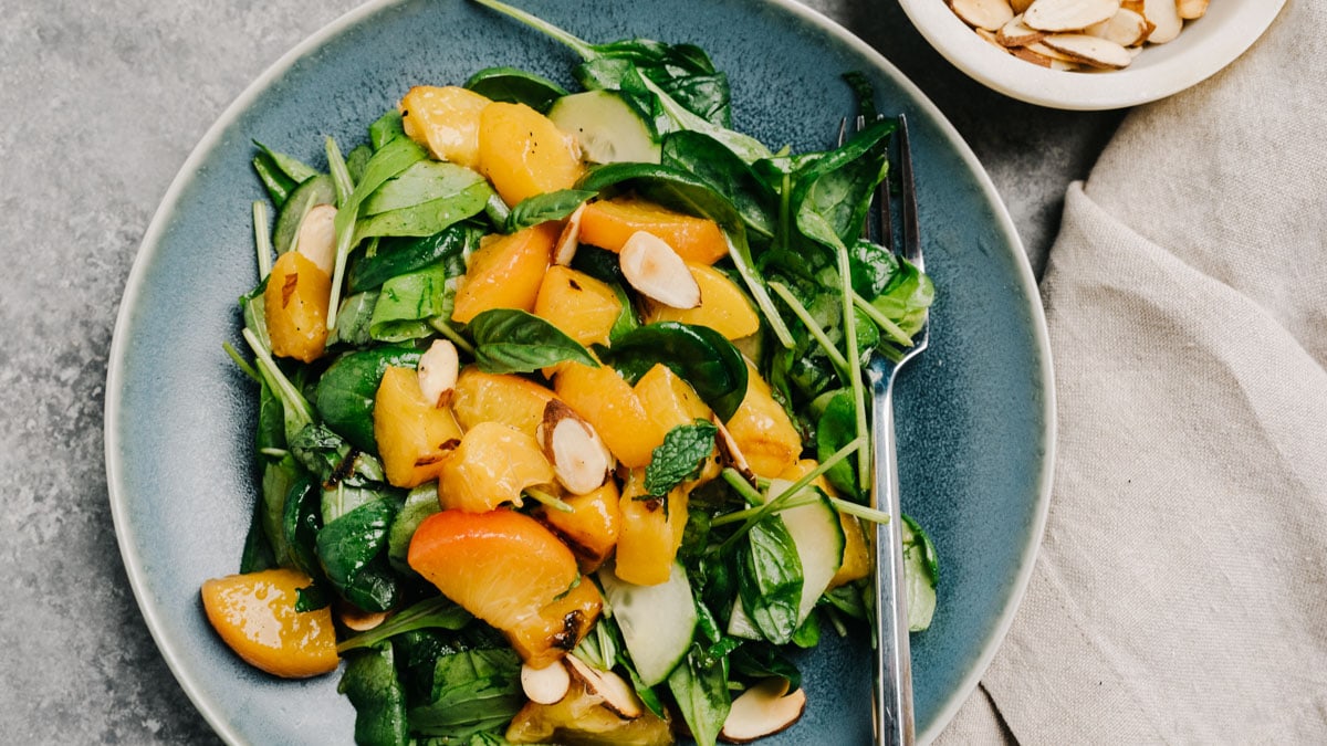 Coloque la rúcula, las espinacas, la albahaca y la menta en una ensaladera grande. Espolvoree los pepinos sobre las verduras, luego coloque los duraznos encima. Rociar con la salsa y decorar con las almendras laminadas. Servir inmediatamente.