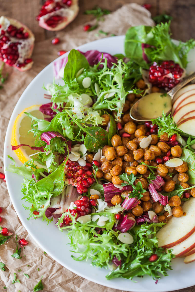 - Vierta la vinagreta sobre las verduras y mezcle bien hasta que se combinen. Disponer la ensalada en platos y añadir los garbanzos crujientes. Atender.