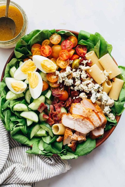 Con tocino, queso azul, huevos y pollo, esta ensalada puede ser bastante pesada, por lo que combinarla con una vinagreta ligera funciona muy bien aquí.