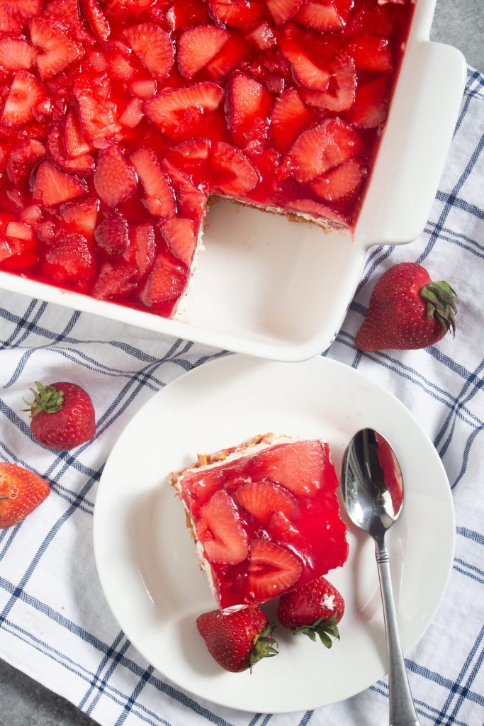 Esta antigua receta de ensalada de pretzel de fresa ha existido durante siglos, ¡y hay una buena razón para ello! ¡A todos les encanta! Son capas de corteza de pretzel dulce y salado con un relleno de queso crema decadente, luego se completa con una capa superior de mermelada de frutas y fresas frescas.