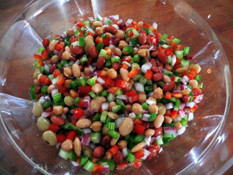 Cortar los pimientos, el apio y la cebolla en cubos y mezclarlos con las alubias.