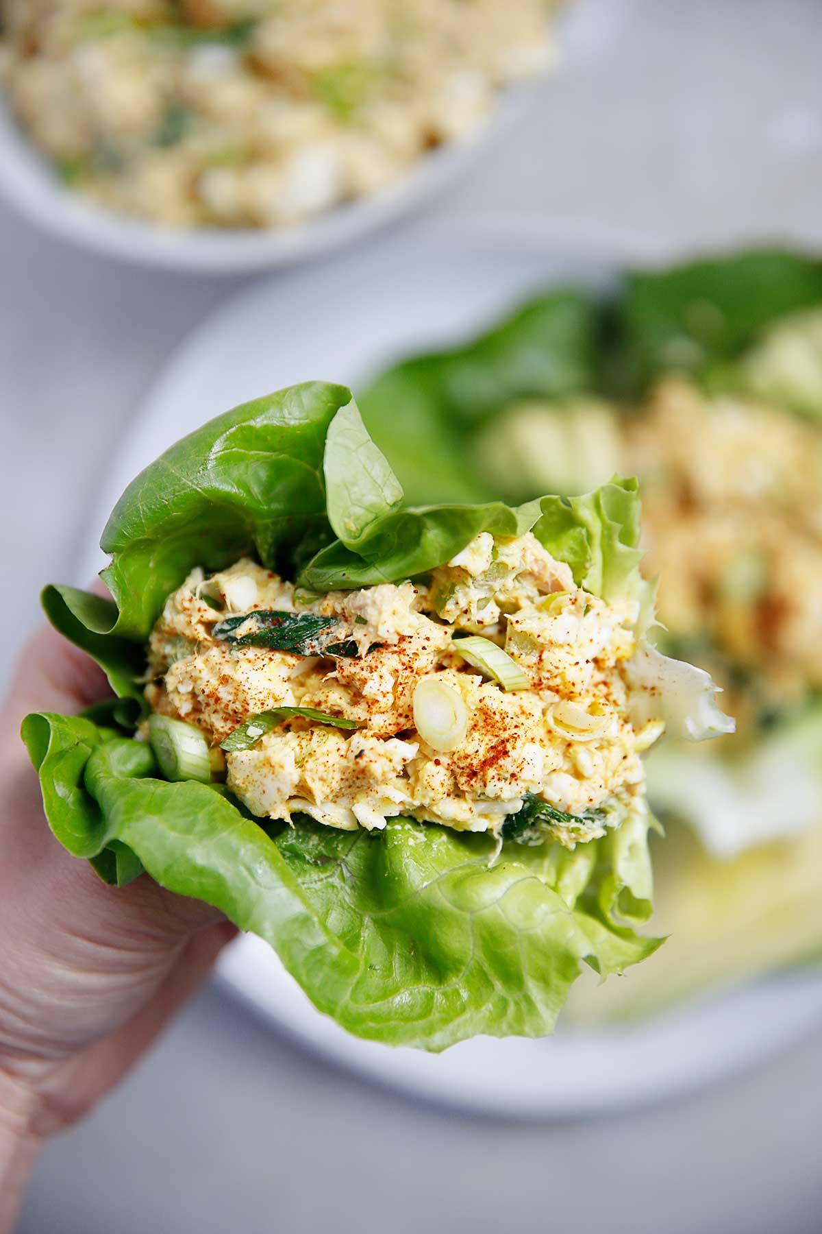 - Retire con cuidado las hojas de la cabeza de lechuga. Colocar una cucharada generosa de ensalada de huevo sobre la lechuga y devorar. ¡Puedes agregar una pizca de pimentón, rodajas de cebollino y aguacate!