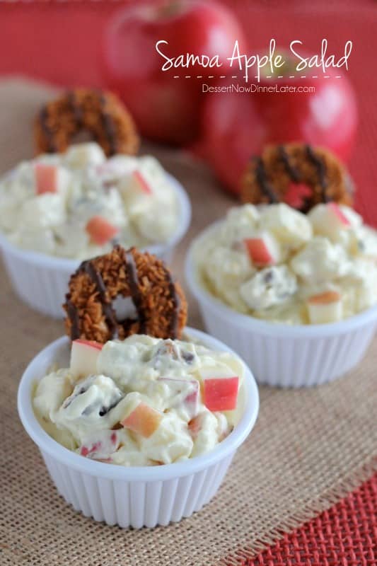 ¡Esta ensalada de manzana samoana es realmente épica! Si eres fan del coco, esta combinación te encantará. Es casi como una ensalada de manzana Snicker, pero con pudín de coco, whisky fresco y crujientes sueños de Samoas/coco. Estoy seguro de que esta receta será popular este verano para comidas compartidas, barbacoas y reuniones familiares. ¡Una cosa que agregaría a esta receta sería caramelo! Dios mío, no pensé en eso hasta que tomé mis fotos. Bueno, en realidad mi esposo pensó en agregar caramelo y le da el toque perfecto. Entonces, lo pondré en la receta para todos ustedes como una opción, pero incluso sin él, ¡es un plato delicioso!
