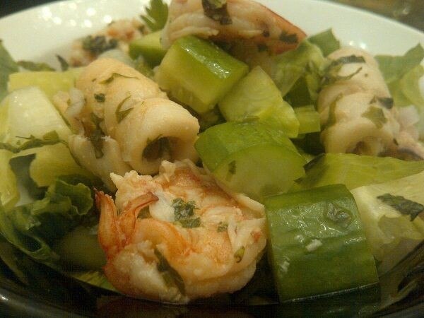 Coloque los mariscos cocidos encima de la ensalada preparada. Exprima más jugo de limón en la ensalada, al gusto.