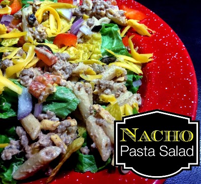 El problema era que las ensaladas solo consistían en pasta y un paquete de aderezo hecho en casa que también agrega leche y mayonesa. Está bien, prueba Hidden Valley, pero voy a necesitar un vegetal o 2. Así que cuando estaba mirando la parte trasera del Southwest Ranch Flavor. Vi que tenían una receta para una “ensalada de pasta con nachos”. Incluía carne molida y algunas verduras. ¡Ahora estamos hablando!