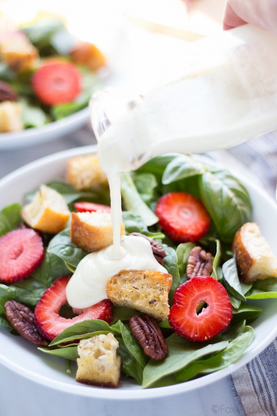 Esta ensalada de nueces, fresas y albahaca con aderezo de queso de cabra es una ensalada de verano dulce y picante llena de sabores frescos y picatostes caseros.
