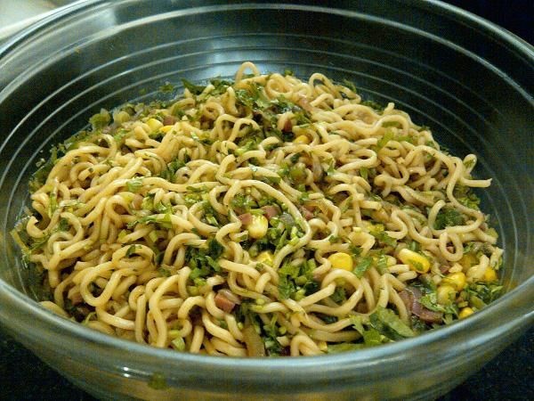 Ensalada de pasta: cocine la pasta según las instrucciones usando bolsitas de sabor, cuele, deje enfriar un poco y mezcle con aceite de sésamo.