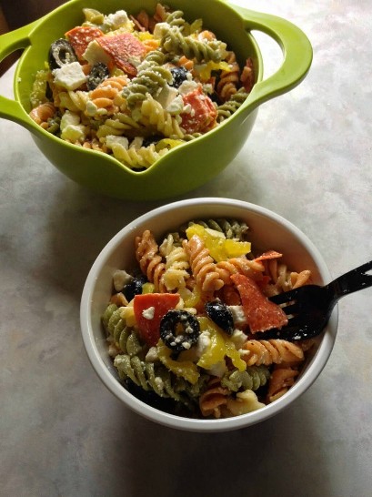 Si te gustan los chiles, el queso feta, las aceitunas negras y los pimientos de plátano, ¡esto es para ti! Ahora imagínalos mezclados con pasta y aderezo para ensaladas… ¡Dios mío, dame un Ziploc (#GLGAZ)!