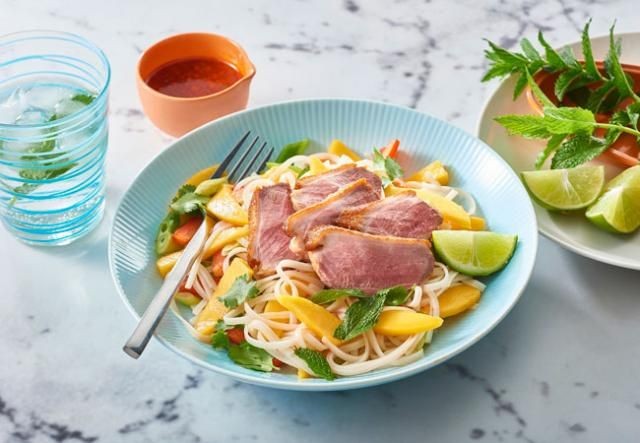Cortar las pechugas de pato y servir con ensalada de pasta de mango. Servir con rodajas de lima.