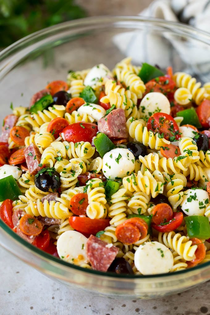 La ensalada de pasta es una comida clásica de verano que combina bien con carnes a la parrilla y es un gran picnic. A menudo preparo ensalada de pesto, ensalada de pasta griega y esta saludable versión italiana para entretener a familiares y amigos.