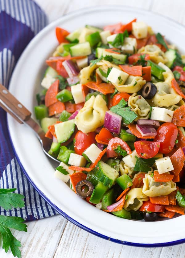 Esta ensalada de pasta tortellini complace a la multitud con ingredientes clásicos de ensalada de pasta como pimientos verdes, aceitunas, cebollas, pimientos y sabrosos trozos de queso. Nunca puedo obtener suficientes verduras, así que también agregué pepinos y tomates. Terminé con toneladas de perejil fresco para condimentar las cosas y una vinagreta casera simple para unirlo todo.