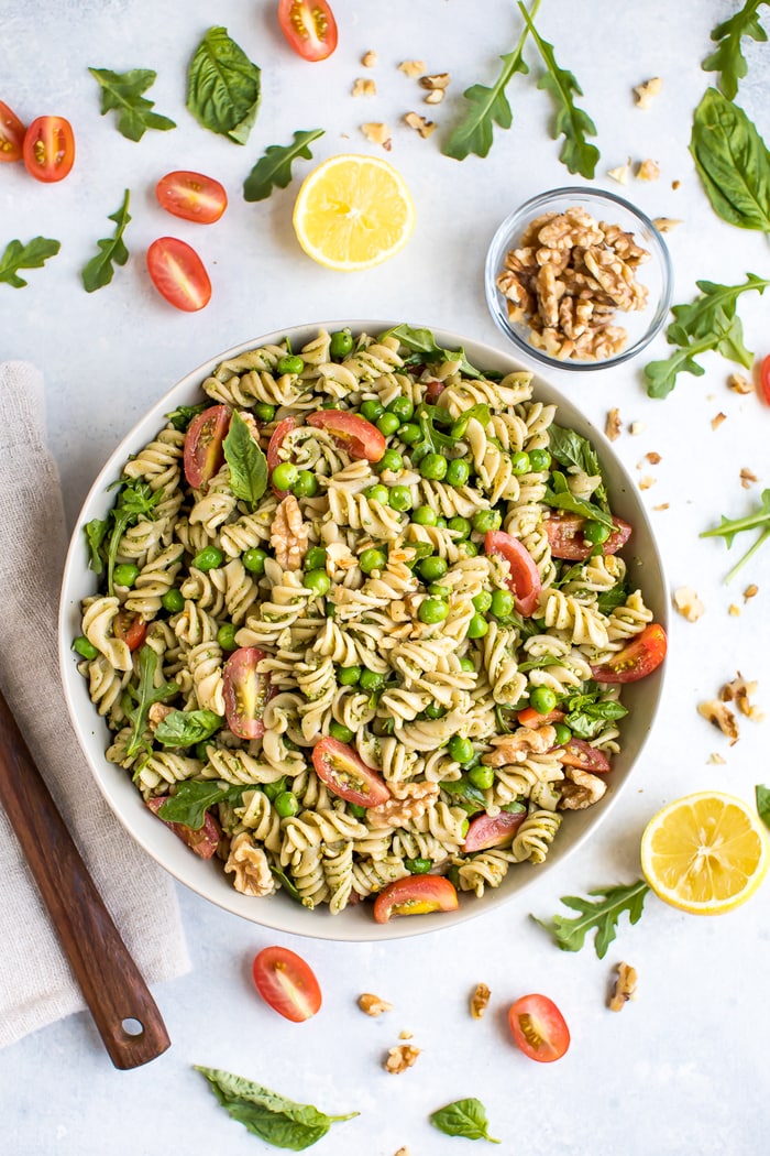 Palabras clave: pasta al pesto, dieta mediterránea, ensalada de pasta saludable, ensalada de pasta