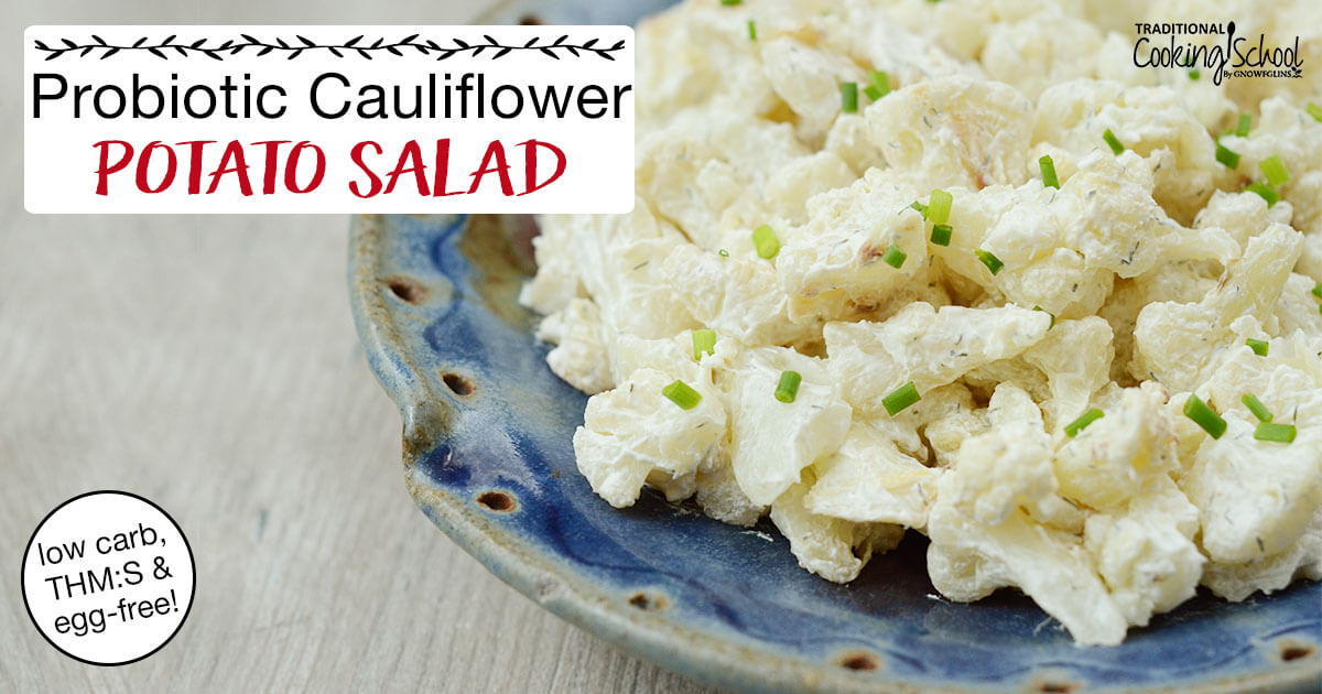 Esta ensalada de papa y coliflor usa crema agria cultivada en lugar de mayonesa, ¡así que incluso las personas alérgicas al huevo pueden disfrutarla! Si bien uso crema agria cultivada con toda la grasa, se puede disfrutar con cualquier tipo de proteína (manteniendo bajos los carbohidratos) para una comida THM: S (satisfactoria).