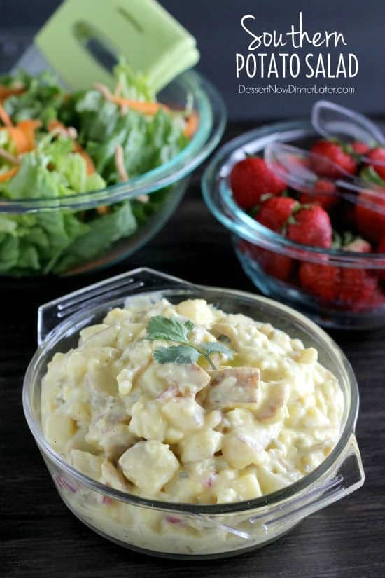 Si quieres probar la ensalada de patata perfecta para llevar a tu próxima barbacoa, ¡entonces tienes que hacerlo! Siéntase libre de agregar apio si le gusta lo crocante de su ensalada de papa, pero sin él está bien. ¡Te encantará esta ensalada de papa sureña! Mi esposo podría comer tan simple como su comida completa, ¡le gusta mucho! ¡Tan bueno!