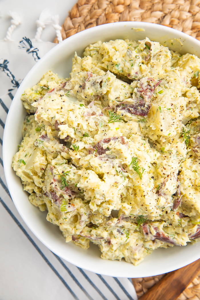 - Las papas rojas son las mejores para esta receta. (obviamente), pero si no los encuentras, Asegúrese de comprar la variedad de papa cerosa, que también incluye papas fritas y papas nuevas. Las papas con almidón, como las rojas, no quedan bien en la ensalada de papas y no tienen esa deliciosa textura cremosa.