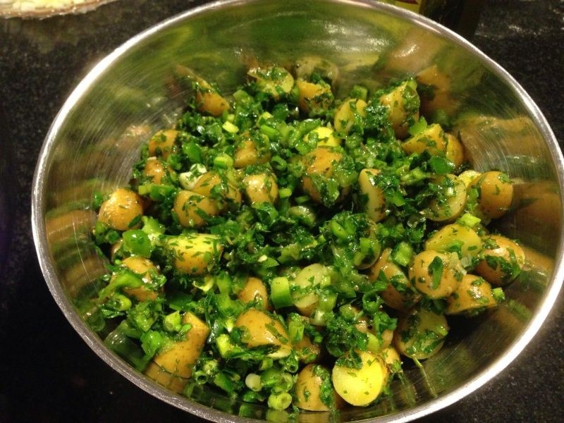 Mezclar todos los ingredientes mientras las patatas aún están calientes. Agrega el aceite.