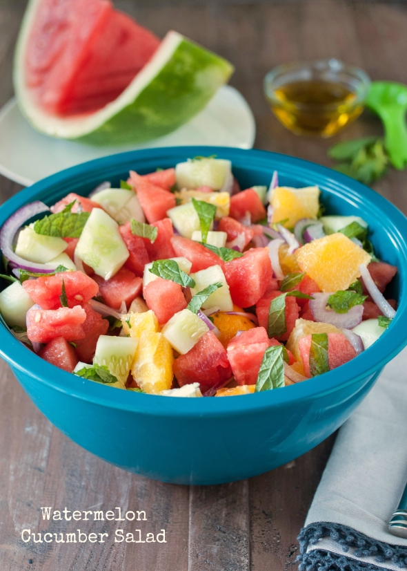 Entonces, cuando miré la mitad sobrante de la sandía que tenía en el refrigerador, me reté a hacer una ensalada con ella. Supongo que podrías llamarlo algún tipo de ensalada de frutas, pero con un toque de pepino, cebolla y limón/aceite de oliva, también es parte de la ensalada de verduras.