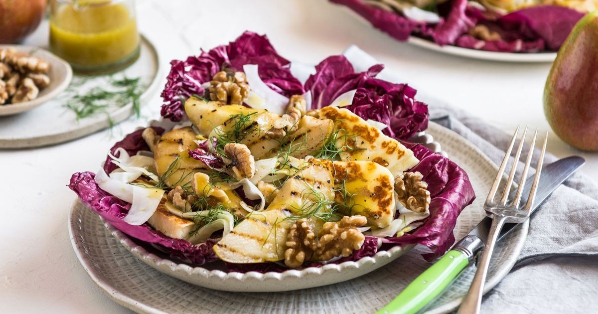 Coloque las hojas de achicoria y el hinojo en un plato ancho y poco profundo. Cubra con pera picante y haloumi. Espolvorear la salsa por encima y espolvorear con las nueces. Decorar con hojas de hinojo.