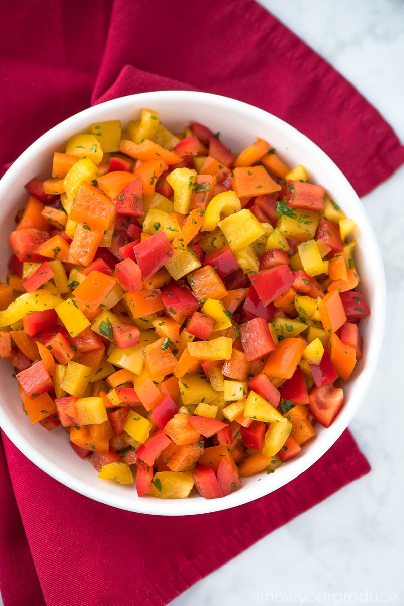 Nos gusta acompañar la ensalada con la mayoría de las comidas ya que agrega sabor y frescura a la receta. Para esta receta, usamos pimientos morrones rojos, naranjas y amarillos. Son pimientos dulces, a diferencia de los pimientos verdes. Es similar a nuestra ensalada israelí pero no lleva tomate, cebolla, pepino ni aceite. Puedes hacer esto usando pimientos picados o en rodajas.
