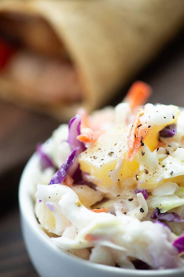¡La ensalada de col con piña es una ensalada dulce y picante que se ensambla rápidamente y alegra cualquier comida de verano! Nos encanta esto servido en sándwiches de cerdo, ¡pero también es un excelente acompañamiento! ¡Esta receta se inspiró en mi viaje al Caribe patrocinado por una princesa!