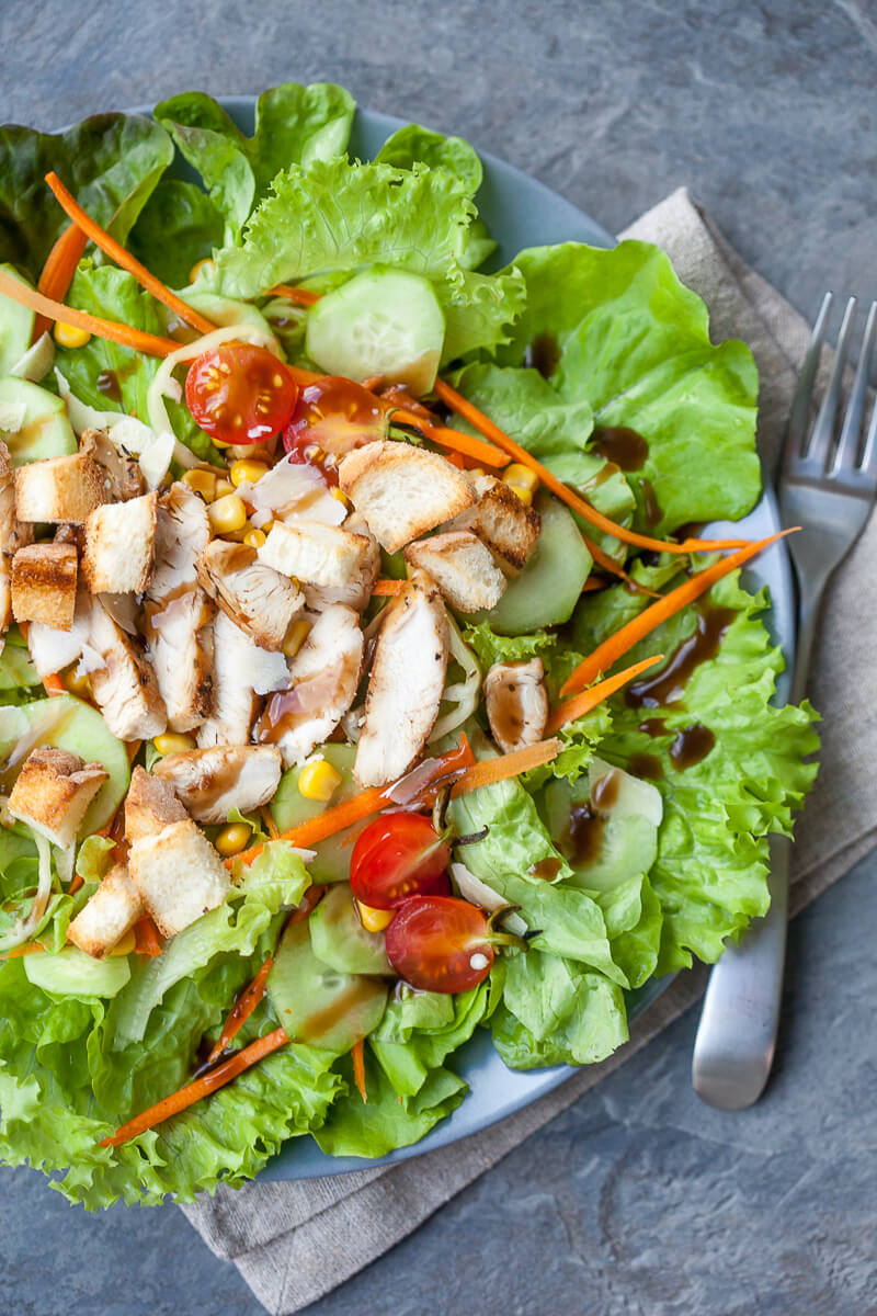 Una de las ensaladas más sencillas que preparo es una simple mezcla de verduras, salsas y pollo a la parrilla con aderezo balsámico. Comeré esta ensalada con más frecuencia, generalmente dos veces por semana. También lo llevo al trabajo para el almuerzo. Es una ensalada refrescante y nutritiva que aprovecha al máximo las verduras de mi huerta.