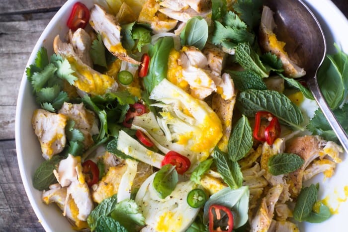 Incluso después de varios años de bloguear sobre comida, nunca me aburro ni me quedo sin ideas. De todos modos, me cuesta filtrar todas las maravillosas posibilidades de decidir qué cocinar en un día determinado. Pero de vez en cuando me encuentro en una rutina, y cuando eso sucede sé exactamente qué hacer, abro uno de mis Libros de cocina de Yotam Ottolenghi y hojearlo. En unos minutos encontraré algo que despierte mi imaginación. Sus recetas combinan ingredientes comunes de maneras tan nuevas que causan una sensación de sabor completamente nueva. Esta brillante ensalada de pollo con azafrán y hierbas es un excelente ejemplo de su genialidad.