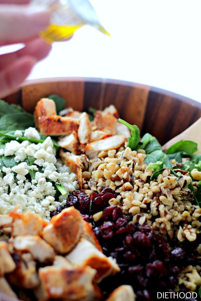 Ensalada de pollo con cerezas y nueces – Deliciosa ensalada de pollo con una combinación de cerezas secas, nueces y espinacas mezcladas con un simple aderezo de aceite de oliva y vinagre.