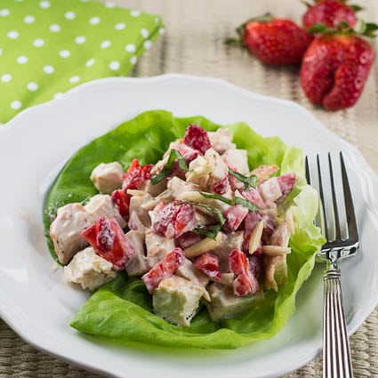 Y por qué no seguir adelante y agregar ensalada de pollo con fresas a la lista. Con un aderezo cremoso, ligeramente dulce y picante hecho con mayonesa y aderezo casero de semillas de amapola, esta ensalada de pollo es un buen cambio de la norma. Mezclado con algunas fresas cortadas en cubitos y esta ensalada está acertadamente vestida para la primavera. Unas pocas almendras picadas agregan un agradable crujido, y un poco de albahaca fresca es el preludio del verano.