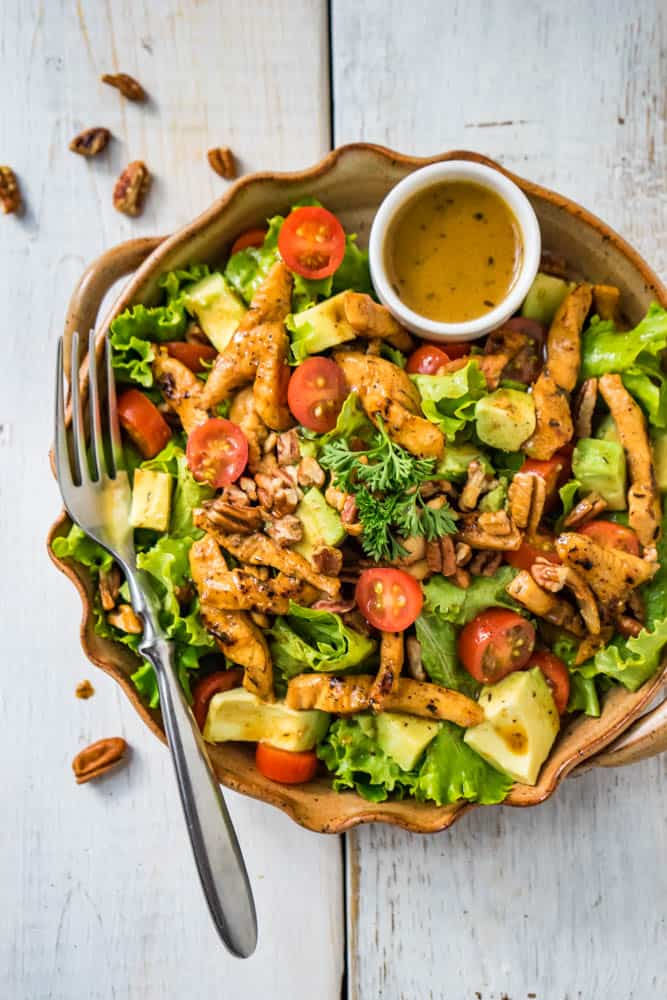 Los cítricos y el pollo tenían que ir juntos, y el pollo y la ensalada tenían que ir juntos. Así que ensalada de pollo a la naranja = ganador. Esta ensalada incluye verduras de hojas verdes crujientes, tomates cherry, aguacate, nueces picadas y, por supuesto, las suculentas tiras de pollo con aderezo picante de naranja.