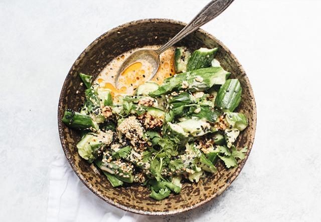 ensalada: Coloque los Qukes en una tabla de cortar y, con el lado de un cuchillo ancho o un rodillo, bata suavemente los pepinos hasta que se rompan. Rasgar o cortar en trozos pequeños. Espolvorea generosamente con sal y deja reposar durante 10 minutos para eliminar el exceso de agua. Drene cualquier humedad.