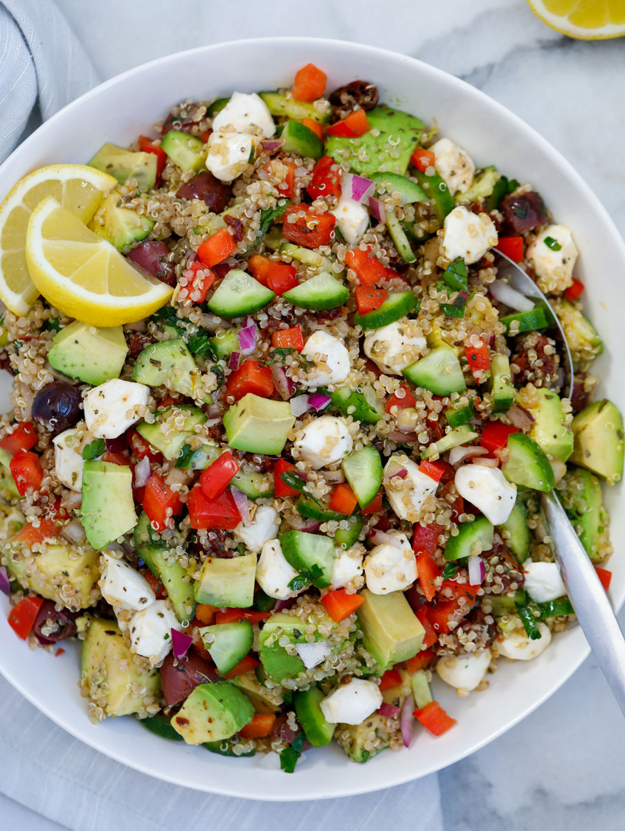 Éste Fácil Ensalada Mediterránea De Quinua tiene un alto contenido de proteínas y está repleto de frescos sabores mediterráneos. Es una ensalada abundante y sustanciosa llena de pepinos, tomates secados al sol, aceitunas kalamata, cebollas, aguacate, lima fresca y mozzarella, ¡muy buena!