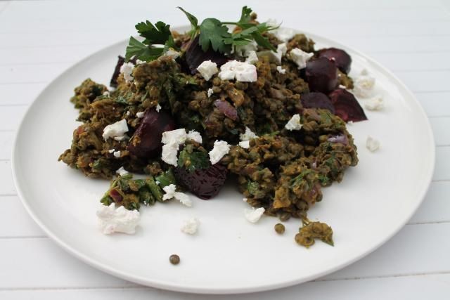 Sirva cubierto con remolachas hervidas y queso feta desmenuzado. Adorne con perejil extra.