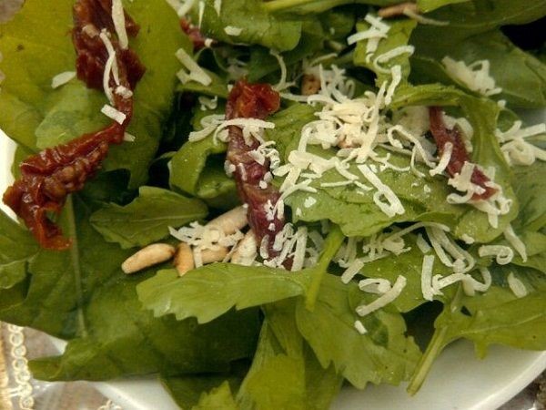 Acuéstese en el fondo de la ensaladera. Añadir nueces tostadas o piñones.
