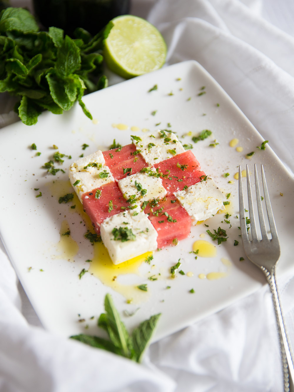 Ensalada de sandía y queso feta con un cal / aceite especias y ráfagas frescas de menta. Una forma increíblemente sabrosa y maravillosamente sencilla de servir una ensalada de sandía.