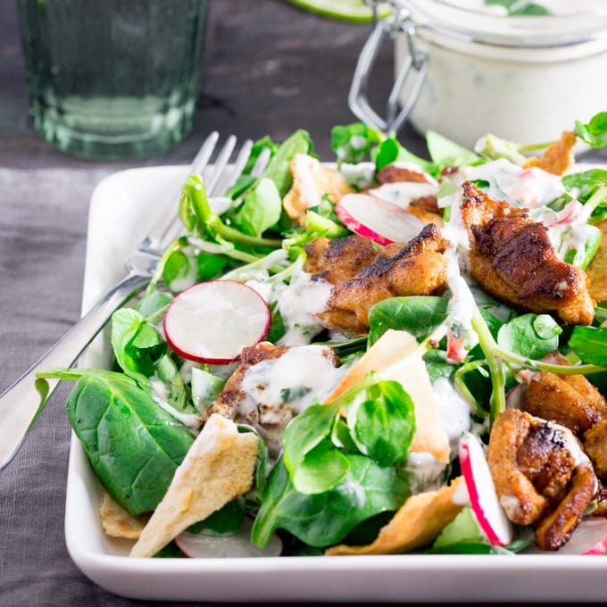 Esta Ensalada de Shawarma y Pollo Pita resultó ser la solución perfecta. Pollo, marinado con ajo y especias, tostado a la parrilla, servido en una ensalada verde fresca, espolvoreado con una pequeña pita tostada crujiente y cubierto con una salsa cremosa y sabrosa con un toque de pimiento rojo.