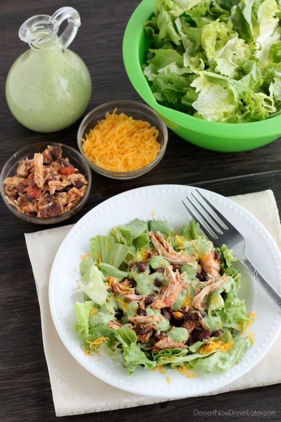 Para hacer la ensalada: Coloque 1 1/2 tazas de lechuga en cada plato, cubra con ¾ de taza de la mezcla de pollo y frijoles, 1 cucharada de queso y 2 cucharadas de aderezo. ¡Gustar!