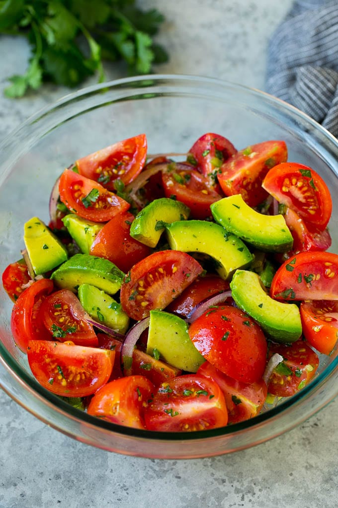 Esta ensalada de tomate y aguacate es una sabrosa mezcla de aguacate, tomate, cilantro, jalapeño y cebolla morada, todo mezclado con un aderezo de limón. Un plato sencillo pero saciante, ideal para picnics y comidas compartidas.
