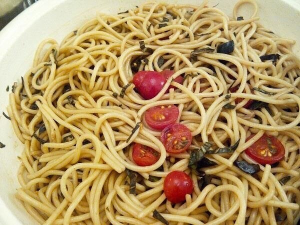 En un tazón grande, combine la albahaca, los tomates, el ajo, las aceitunas, el aceite y el vinagre.