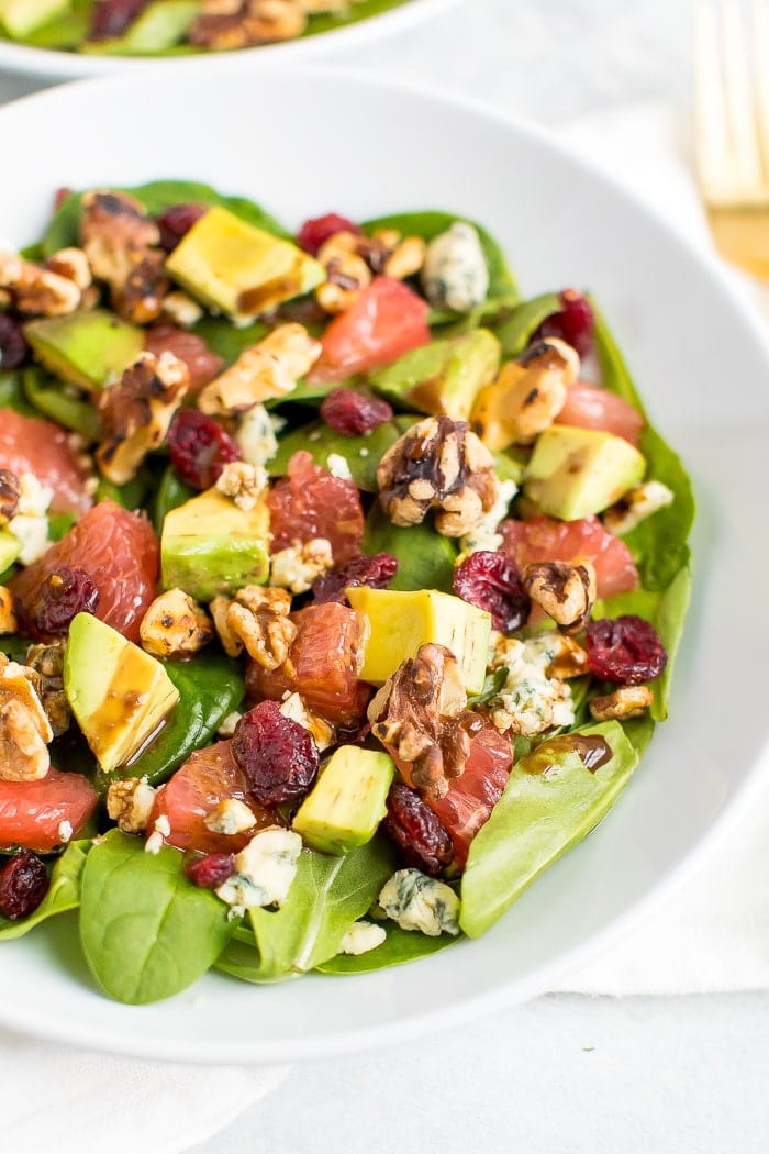 La toronja está en temporada durante los meses de invierno y el rojo y el rosa combinan perfectamente con el esquema de colores del Día de San Valentín, así que si planeas quedarte este año, ¿por qué no preparar esta deliciosa ensalada para tu Día de San Valentín (o para ti)? ? Apuesto a que te enamorarás de la mezcla de rúcula picante, aguacate cremoso, queso azul y frutas. Puedes servirlo como aperitivo o ensalada o añadirle un poco de proteína y servir como plato fuerte. Creo que sería genial con mariscos, tal vez camarones a la parrilla, vieiras o salmón.