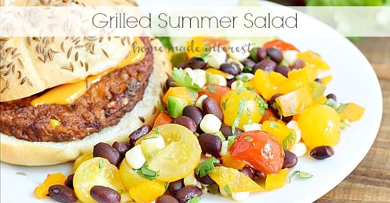 Después de que todo estuvo cocinado, terminé mi ensalada a la parrilla con una vinagreta de limón casera. Es solo una mezcla simple de jugo de limón, aceite de oliva y sal, pero agrega un brillo a la ensalada que la lleva al siguiente nivel. He servido mis verduras asadas como acompañamiento de mis hamburguesas picantes de frijoles negros, pero también es un excelente aderezo para hamburguesas.