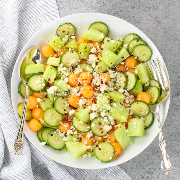 Debe amar una comida de 15 minutos que pueda preparar con anticipación. Se mantiene bien en la nevera y es aún mejor cuando la salsa se remoja en los melones y los pepinos. Me gusta agregar queso antes de servir.