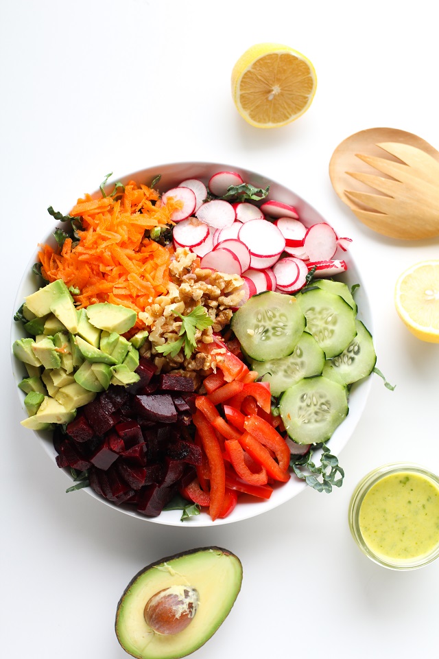 Una vibrante ensalada desintoxicante con col rizada, zanahorias, pimientos, rábanos, pepinos, aguacates, nueces, remolacha y vinagreta de limón y perejil. Esta sabrosa ensalada está repleta de vitaminas, minerales, antioxidantes, grasas saludables y proteínas.
